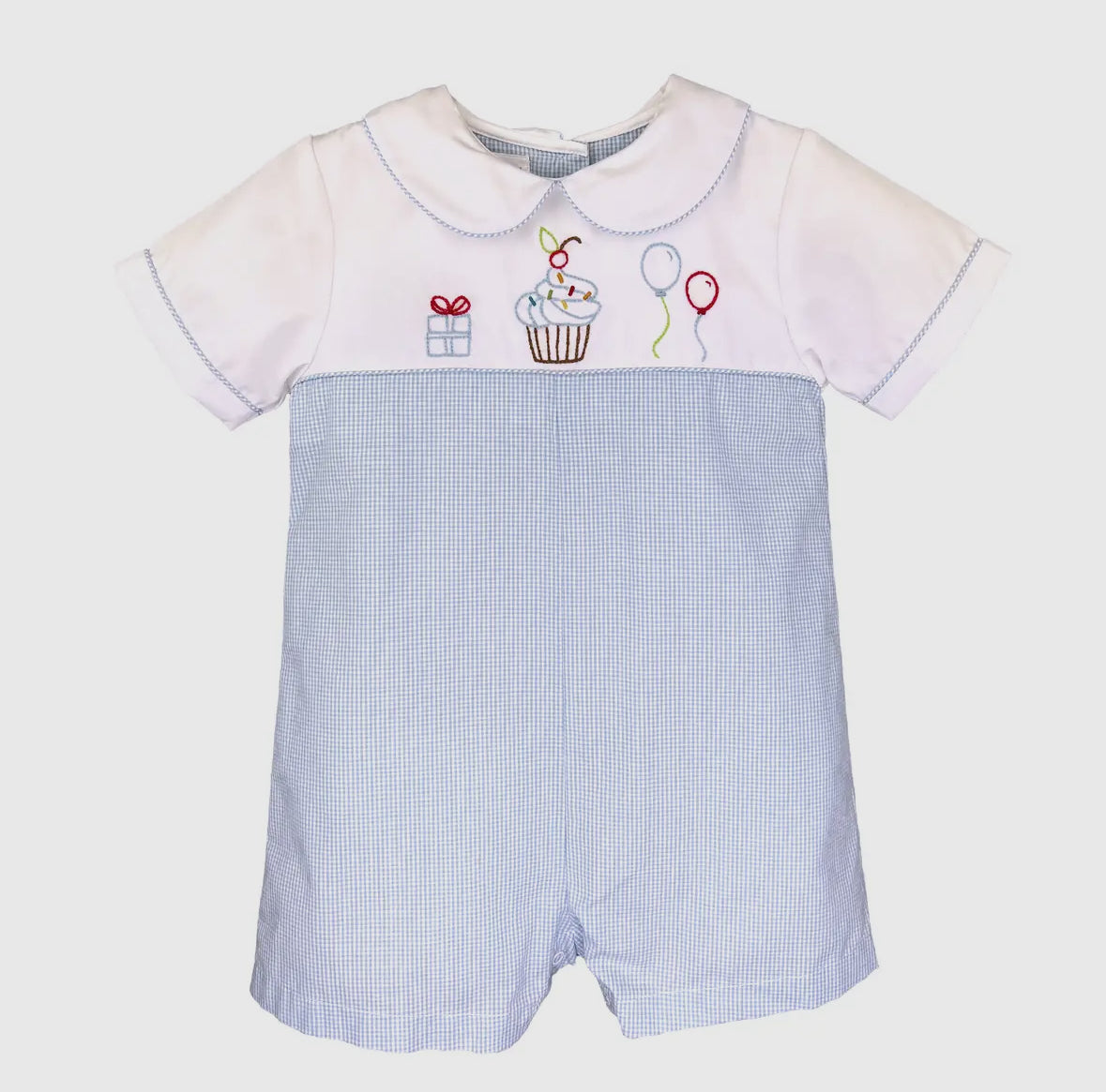 This adorable embroidered romper is the perfect Birthday outfit! This simple yet sweet short sleeve romper features embroidered cupcake and balloon design on the front and is perfect for wearing for birthday parties and photo shoots! Feathers a delicate blue trimmed edge that adds just the right amount of details. The lightweight and airy blue check fabric keeps little ones cool and comfortable and is easy to care for - just machine wash and tumble dry!
