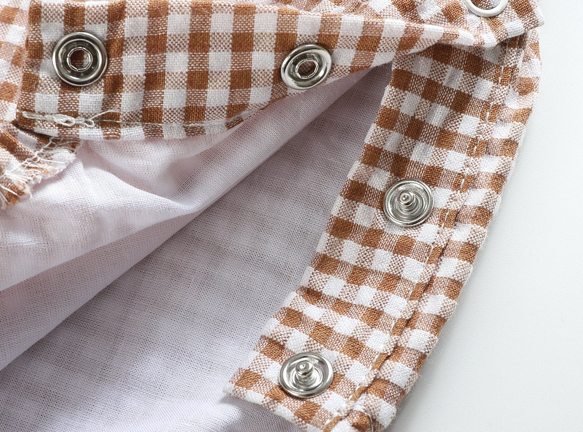 This adorable brown gingham romper is soft, cool and easy to care for. Perfect to wear as is or ready for your embroidery or monogram with its blank front panel. The snaps make it easy for a quick change which is great for you and your cutie.