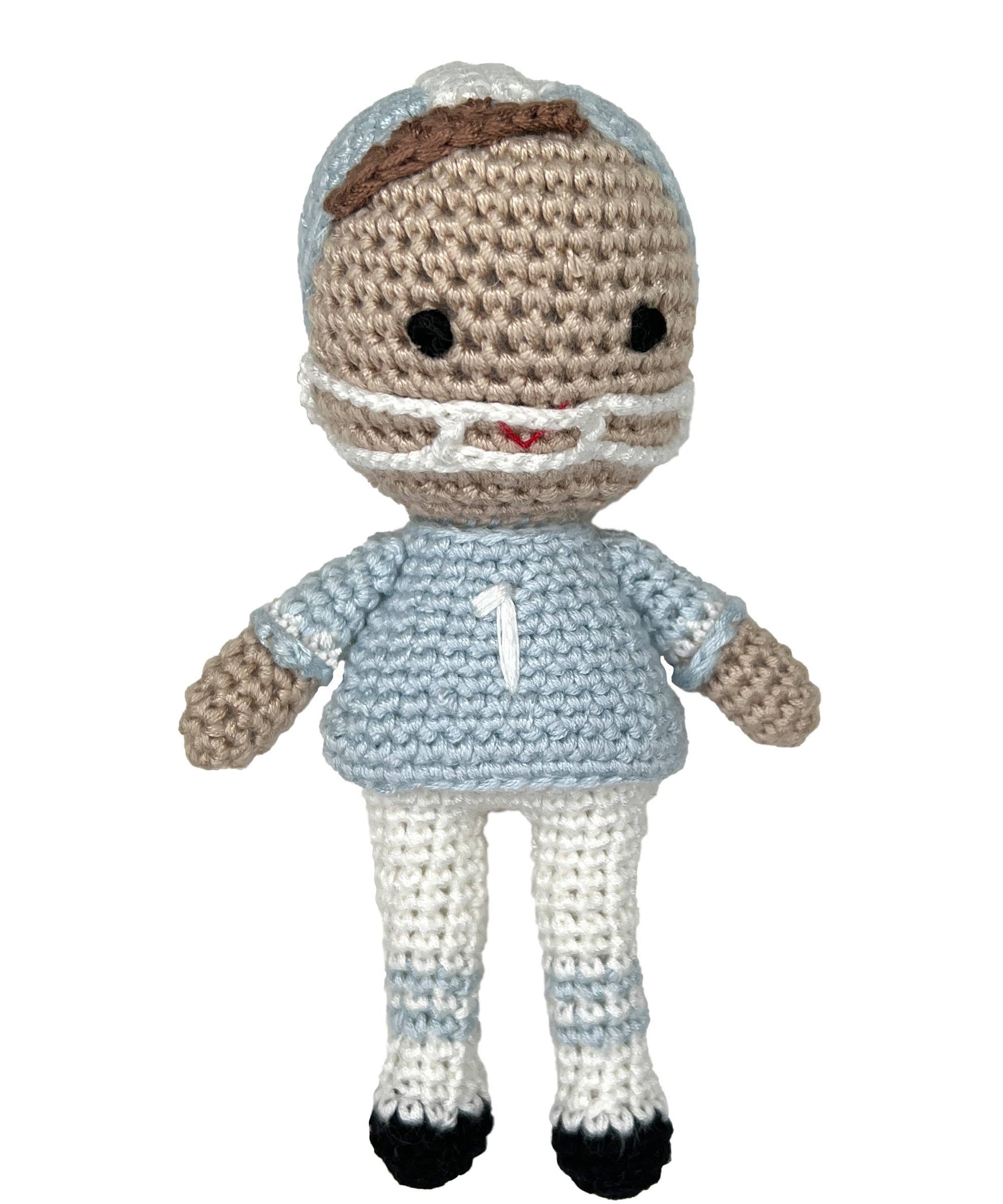 Features a bumpy crochet texture that is perfect for little hands to grasp and hold while also helping to develop babies sense of touch and feel. These organic crochet football player rattles are also easy to care for, just machine wash and lay flat to dry! Can also also make a great Christmas tree ornament too!