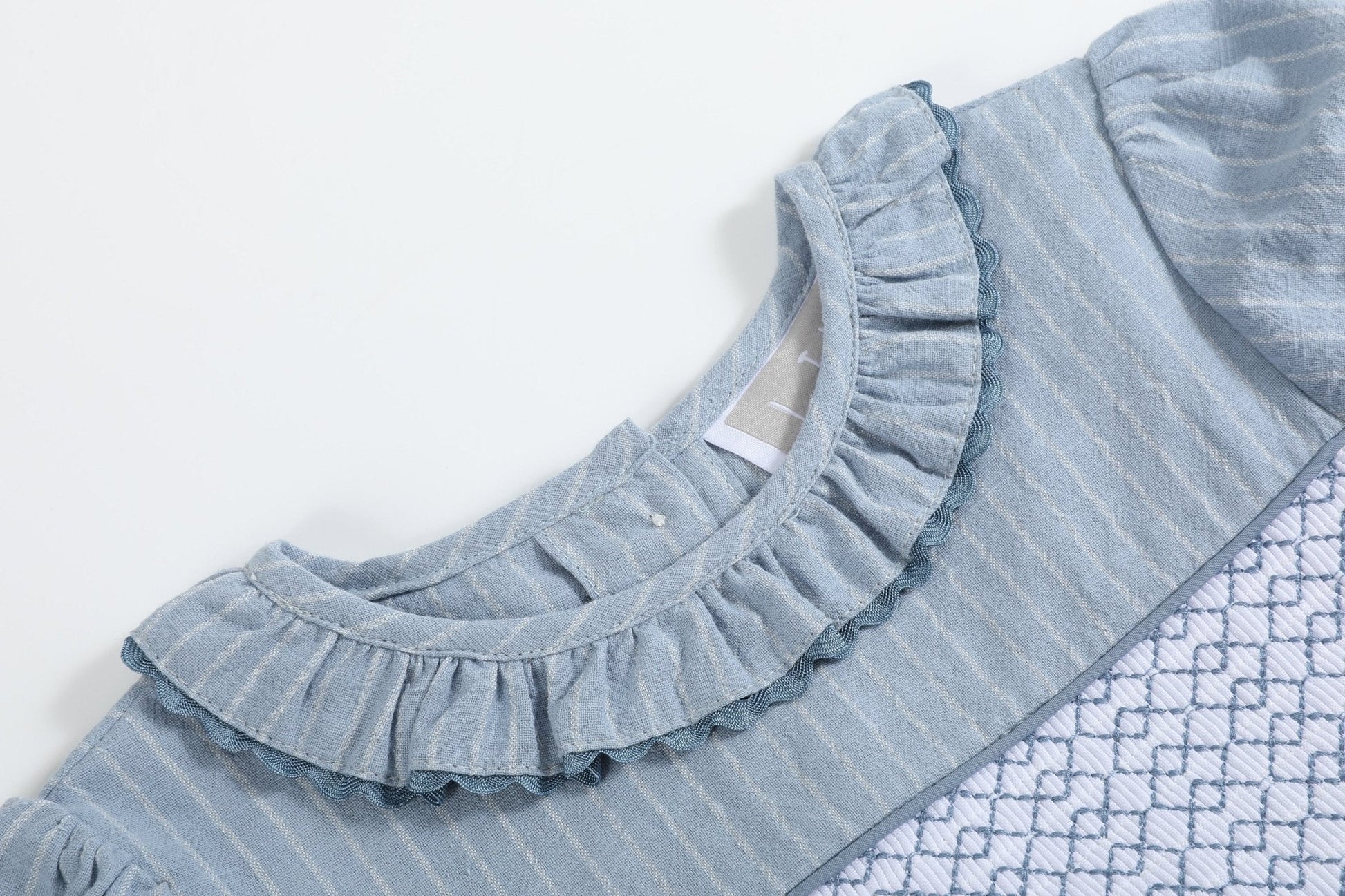 Let your sweet girl dress to impress in this Blue Pinstripe Smocked Ruffle Collar Dress! The smocked chest adds classic detail, while the ruffle collar brings a whimsical touch to the design. A stylish tie-bow in the back enhances the charm and ensures the perfect fit. This dress is ideal for special occasions, family gatherings, or any event where she wants to shine.