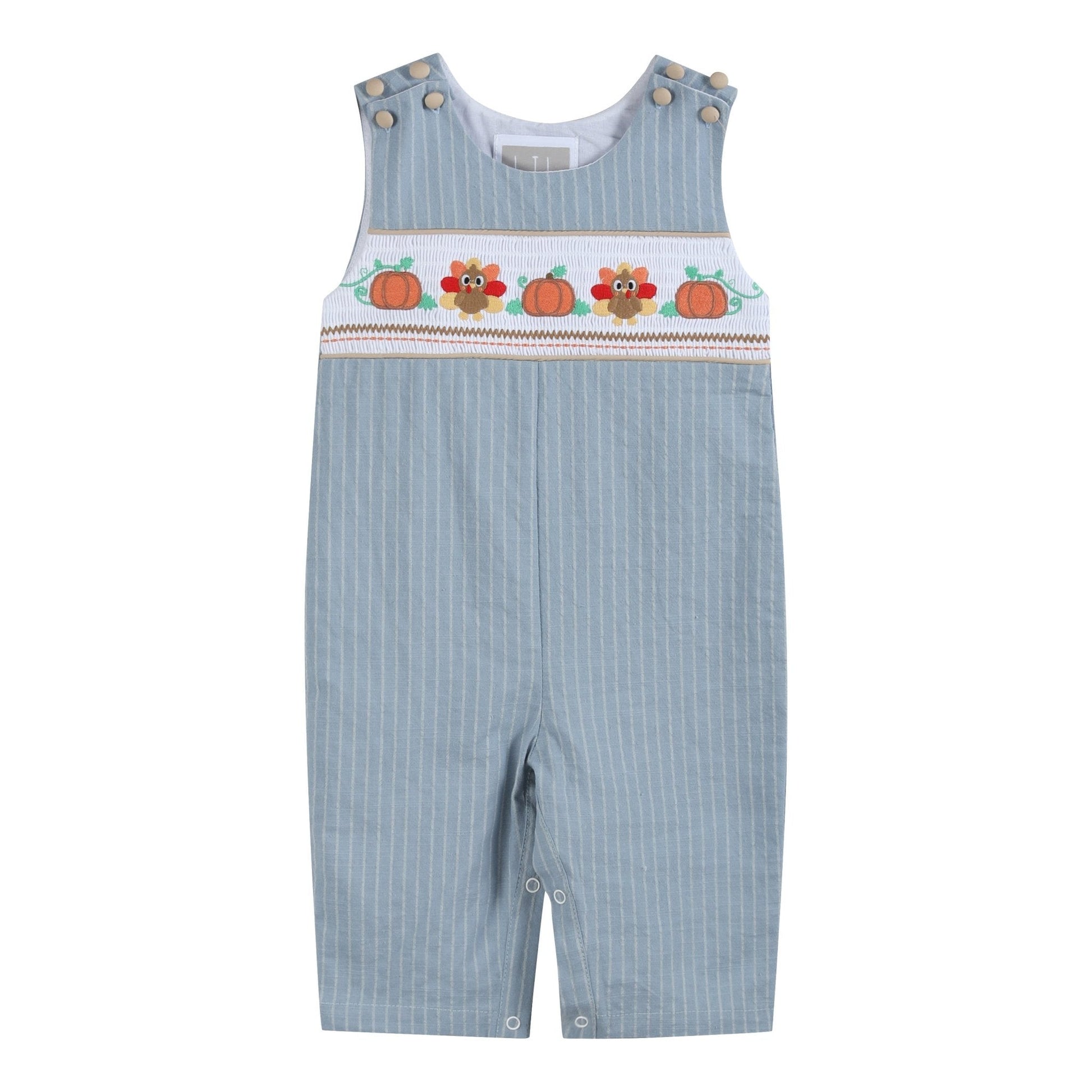 These Light Blue Pinstripe Turkey Smocked Overalls are a charming choice for your little boy this Thanksgiving season. Featuring smocking at the chest with adorable turkey and pumpkin embroidery, they add a festive touch. Buttons at the shoulder ensure adjustable sizing, while snap enclosures make diaper changes quick and easy. Perfect for Thanksgiving gatherings, family photos, and holiday celebrations, these overalls will keep your little turkey cozy and stylish all season long.