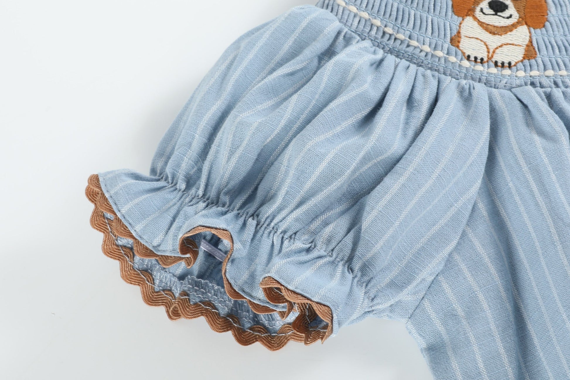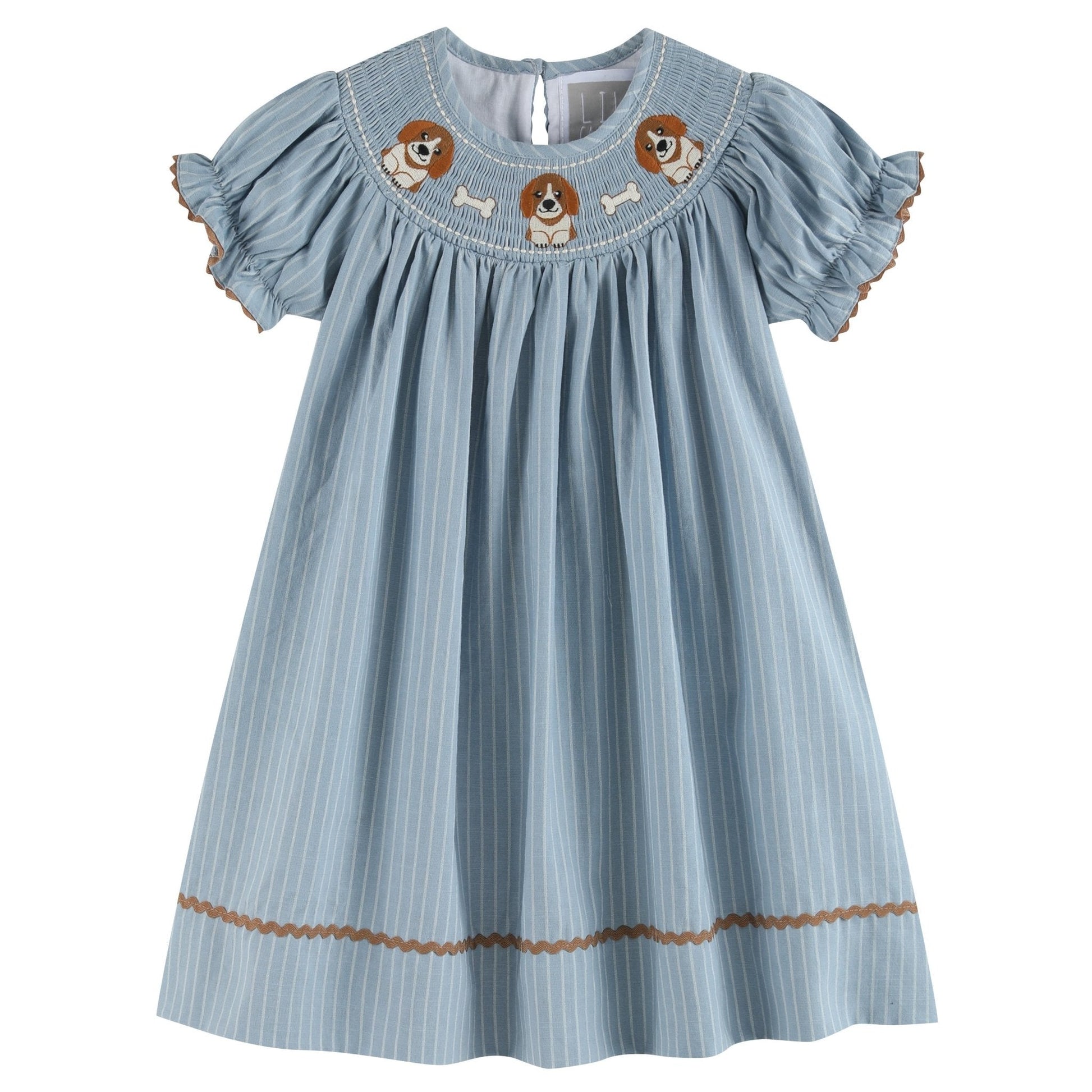Dress your little one in pure sweetness with our Light Blue Puppy Smocked Bishop Dress! Featuring adorable smocking along the neckline with embroidered dogs, this dress is as cute as can be. Made in a pretty light blue cotton, it's the perfect choice for an effortlessly charming look. From walking the dogs to playdates with friends your sweet girl will be looking picture-perfect.