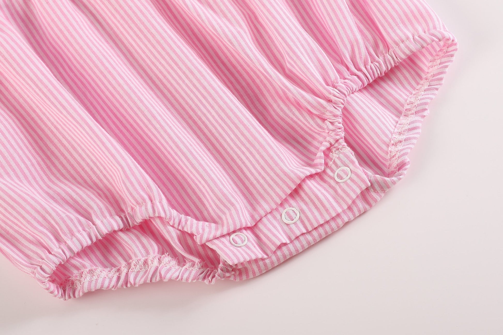 Your tiny darling will be so sweet in this pink-striped romper. This adorable romper has smocking detailed with pretty Lil Sister embroidery. Also features ruffles at the neckline and cute flutter sleeves. Buttons along the back allow it to slip easily over their head and snaps on the crotch allow for easy diaper changes.