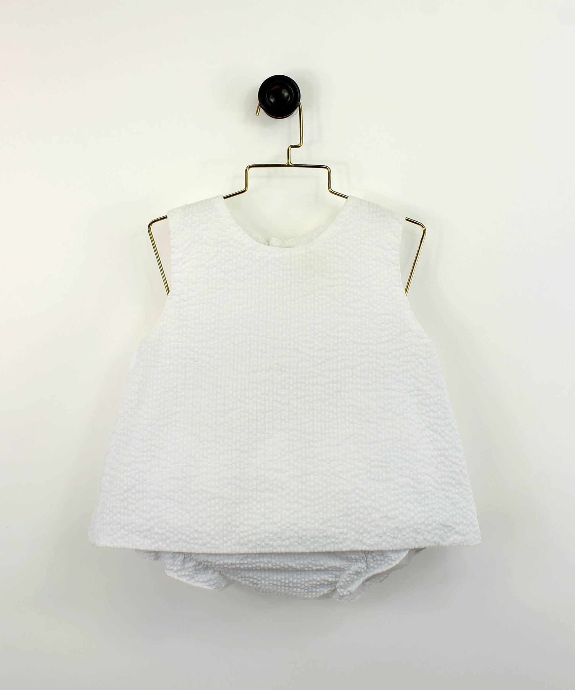 This sweet little popover is perfect for Spring and Summer, the simple yet classic top features a bow on the back and comes with matching ruffle butt bloomers.